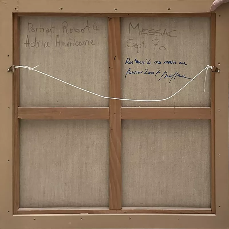 Signée, datée et titrée Messac, Sept. 70, Portrait Robot 4 Actrice Américaine au verso de l’œuvre ; annotée et signée “Restauré de ma main en février 2007, Messac” au verso de l’œuvre
