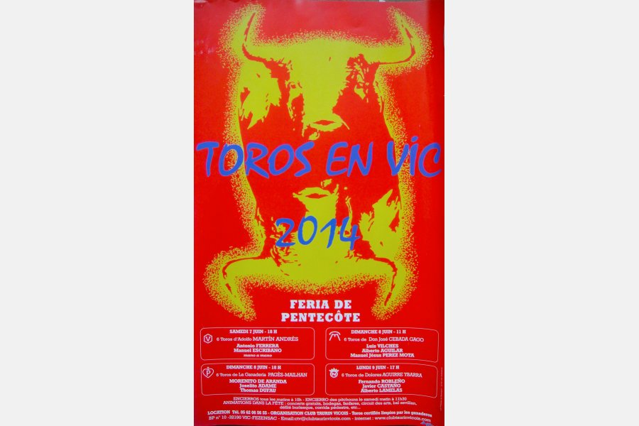 Á l’invitation de Jean-Paul Chambas, j’ai conçu l’affiche de la Feria de Vic 2014. Cela fait plus de trente ans que Jean-Paul propose cet exercice à des peintres. Je suis très honoré qu’il ait pensé à moi car j’ai toujours grand plaisir à dessiner une affiche, surtout à la demande d’un ami. La manifestation TOROS EN VIC 2014 elle se déroulera du 7 au 9 juin à Vic-Fezensac 32190.