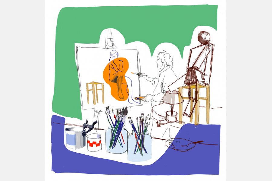 Ivan Messac s’il s’amuse à reprendre ce thème, le fait avec humour. Ses peintres ne parviennent pas à regarder leurs modèles bien en face. Ils usent de stratégies pour les croquer. L’un gravit une échelle, l’autre use de grilles pour mettre aux carreaux, chacun tente de voir ce qu’il ne voit pas. Le corps du modèle devient une masse colorée, le modèle est derrière le peintre qui, du coup, l’imagine nue, le modèle n’en peut plus il s’échappe de la toile au grand désespoir de l’artiste … fuite vers une piste de danse… vers un autre tableau ?
