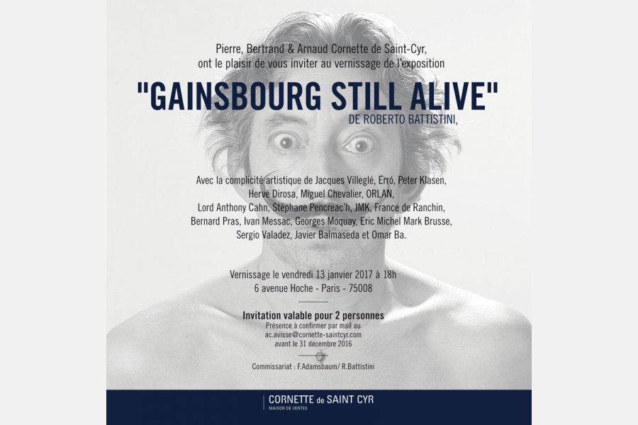 Bravo à Roberto Battistini qui a su faire partager par 18 artistes de renom, son hommage à Serge Gainsbourg. Cette exposition sera présentée dans de nombreuses autre ville, mais c'est à Paris en l'étude de maître Cornette de Saint Cyr qu'elle a été inaugurée.