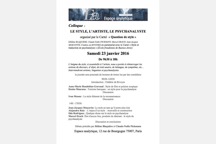 Je serais très heureux si vous pouviez libérer un peu de temps le matin du samedi 23 janvier pour suivre ce colloque dont je suis l'un des intervenants. J'y exprimerai mes idées sur le style et l'artiste en me gardant bien de parler de psychanalyse que je ne connais que par alliance.
