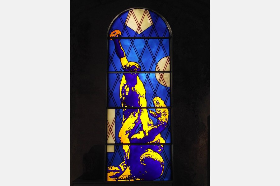 A la demande de Jacqueline et Michel Philippart j'ai réalisé le dessin de ce vitrail pour la Chapelle Saint Sylvain à Nevers dont ils sont propriétaires. Tout à commencé avec une commande d'un vitrail à François Morellet. D'autres artistes contemporains ont apporté une contribution à la vie de cette chapelle. Parmi eux : Claude Viallat, Jean Le Gac, Claude Lévêque, Errò, François Boisrond … Michel Philippart me fais savoir que ce vitrail est bien plus beau qu'il n'y parraît sur la photo… J'ai hâte de le vérifier !